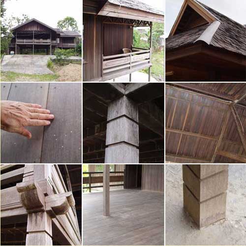 築30年が経過した、ビリアン材使用住宅の経年変化例・・・木材材料の99%がウリン材となっており、外見上における色の経年変化はございますが、構造上の強度に関する問題は全くございません。また、コンクリートへ直に埋設させたウリンの柱も、腐食は全く見られないほどの耐久性を誇っています。 |